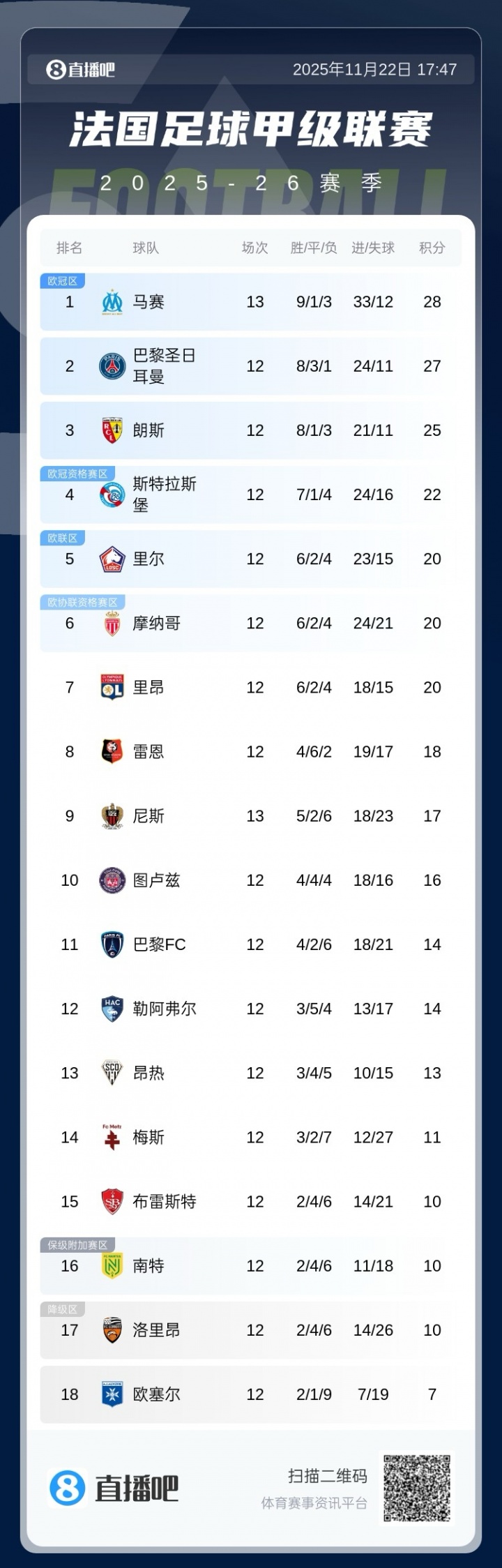 欧塞尔本赛季法甲当今12轮积7分,当今在法甲积分榜垫底。