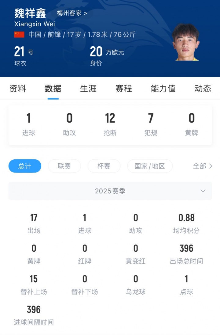 本年上半年,魏祥鑫曾赶赴欧塞尔试训。本赛季魏祥鑫为梅州出战17场成绩1球。