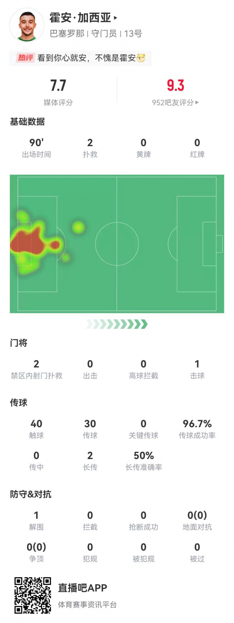宽心!霍安·加西亚本场2扑救1突围+30次传球29得手,获评7.7分