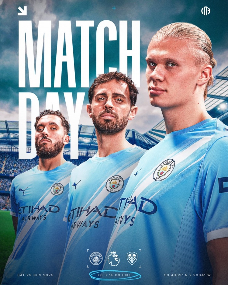 曼城发布对阵利兹联海报:哈兰德、B席、谢尔基出镜