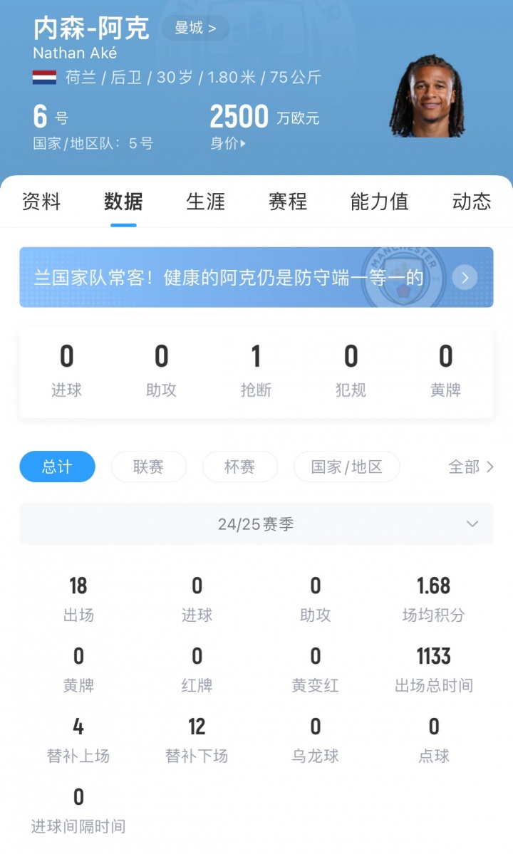 阿克现年30岁,他上赛季共为球队出场18次,认为1133分钟,当今德回身价为2500万欧。