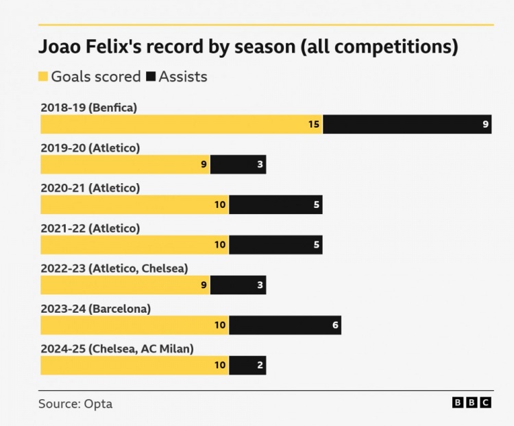 讨论到菲利克斯在切尔西的初度租赁并未掀翻浪潮,一年后蓝军豪掷4500万英镑将其买断果然令东谈主巧合。两边坚决了一份长达七年的合约——而他在只是践约一年,便提前离队。