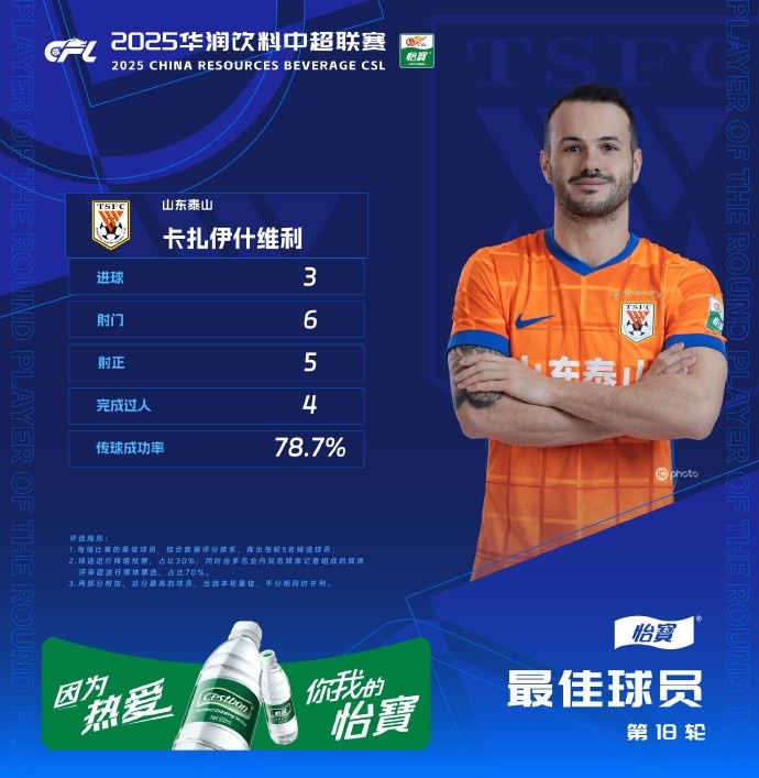 演出帽子戏法!官方:泰山外助卡扎伊什维利 当选第18轮最好球员