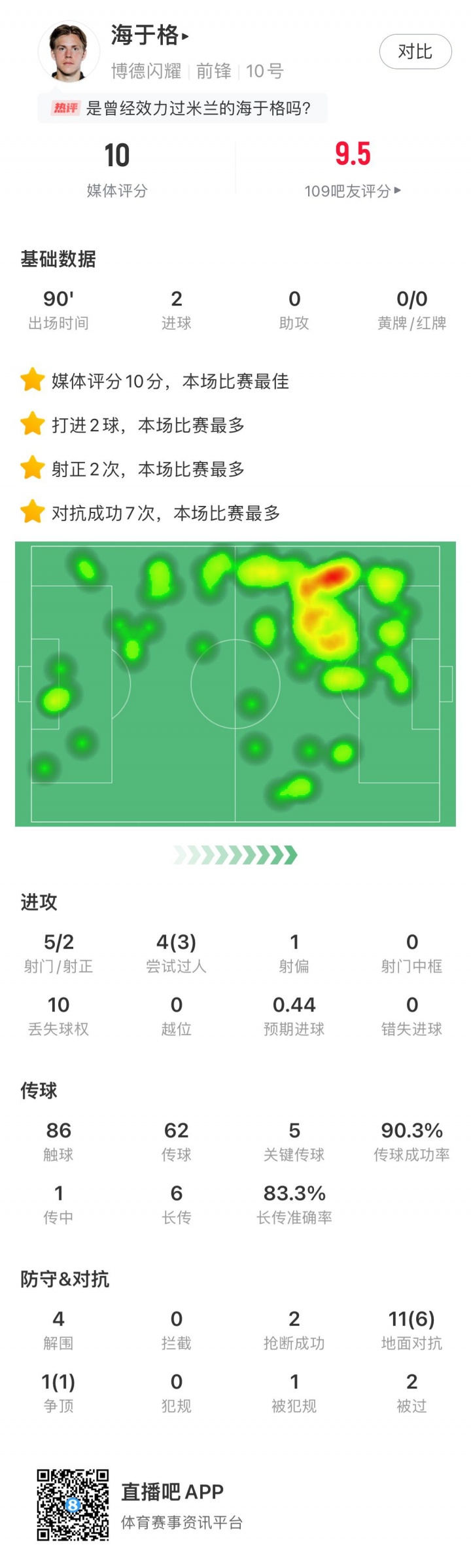 10月01日讯 欧冠联赛阶段第2轮,博德精明主场2-2平热刺,25岁的海于格梅开二度,媒体评分10分。