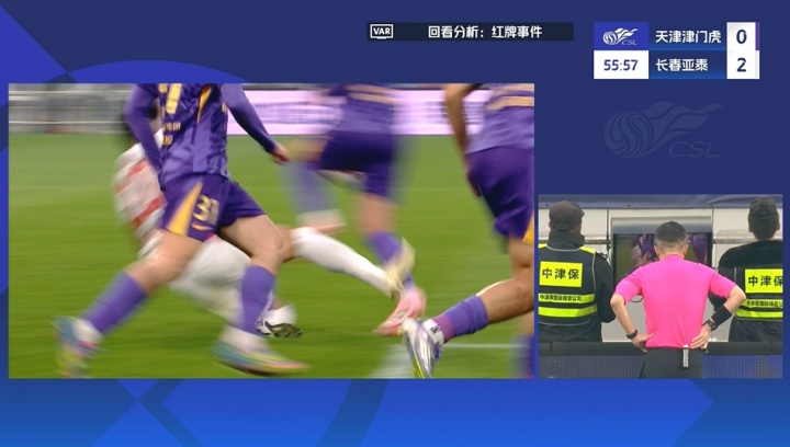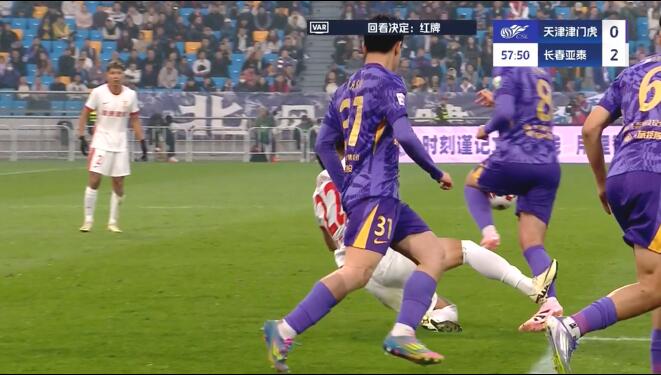 10月25日讯 津门虎vs亚泰第58分钟,王禹放铲蹬踏哈达斯小腿,主裁先是给了黄牌,随后长技能不雅看VAR回放后改判红牌,将其直红罚下!