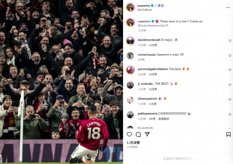 传射立功!卡塞米罗社媒晒情谊滑跪庆祝照:3连胜!曼联加油!