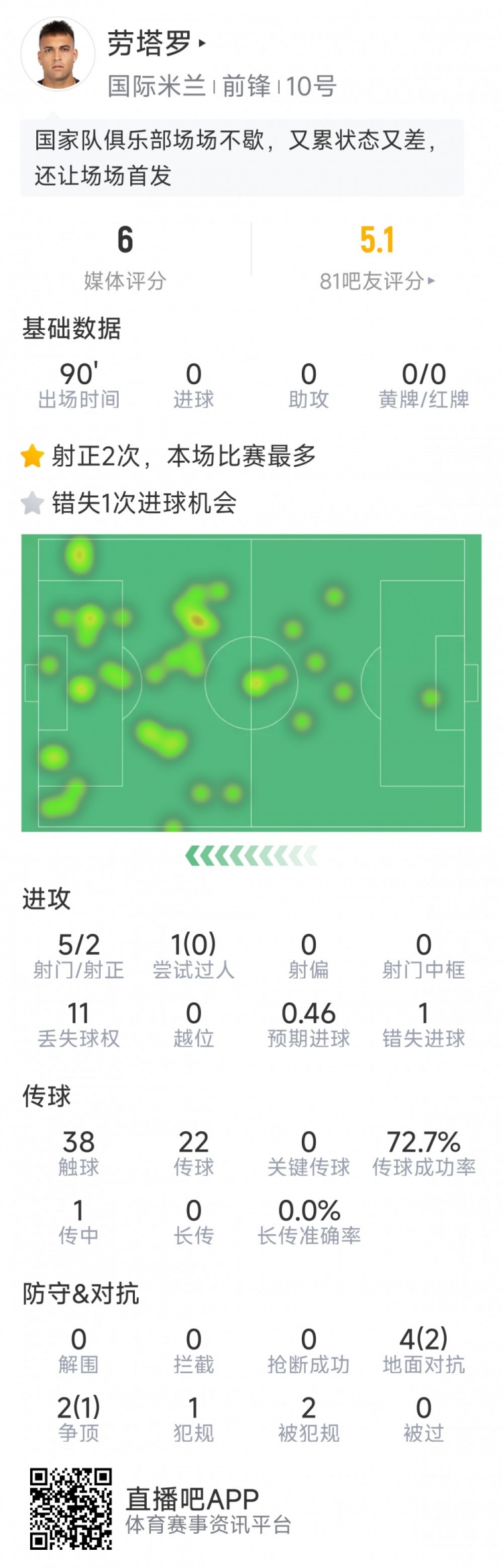 还需调度,劳塔罗本场数据:5射2正,1次错失良机,评分全队最低