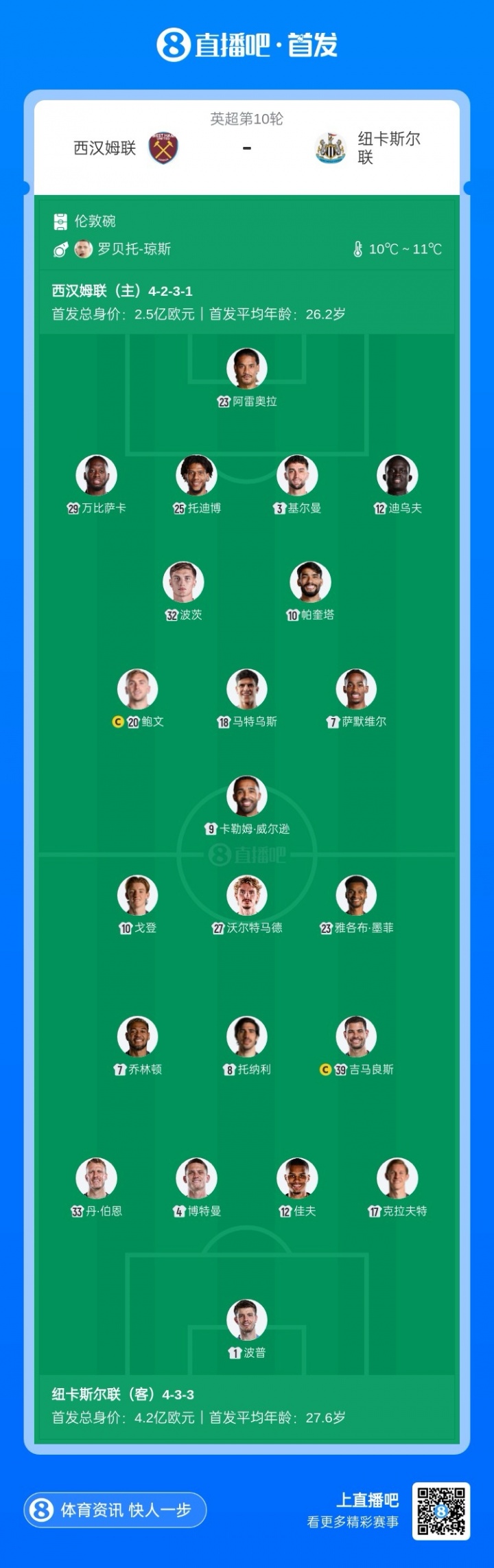 11月02日讯 北京时辰22:00,英超第10轮,西汉姆联vs纽卡,赛前两边首发公布!【本场比赛西汉姆联方面,威尔逊出任单箭头,波茨、帕奎塔搭档中场,纽卡方面沃尔特马德出任中锋,吉马良斯,托纳利镇守中场】