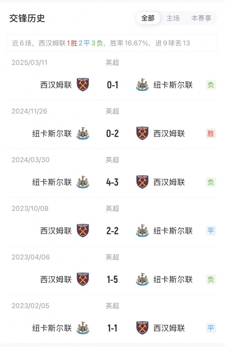 现在英超积分榜上,西汉姆联1胜1平7负,位列第19;纽卡斯尔联3胜3平3负,位列第13