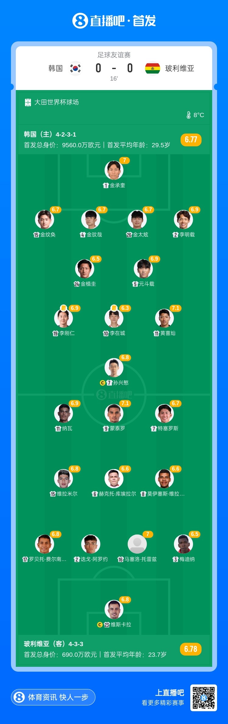 半场-韩国暂0-0玻利维亚 金太炫耸立蒙泰罗失良机 李刚仁染黄