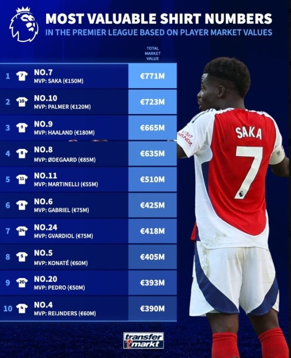 英超球衣号码市集价值排名:7号萨卡总市集价值7.71亿欧居首