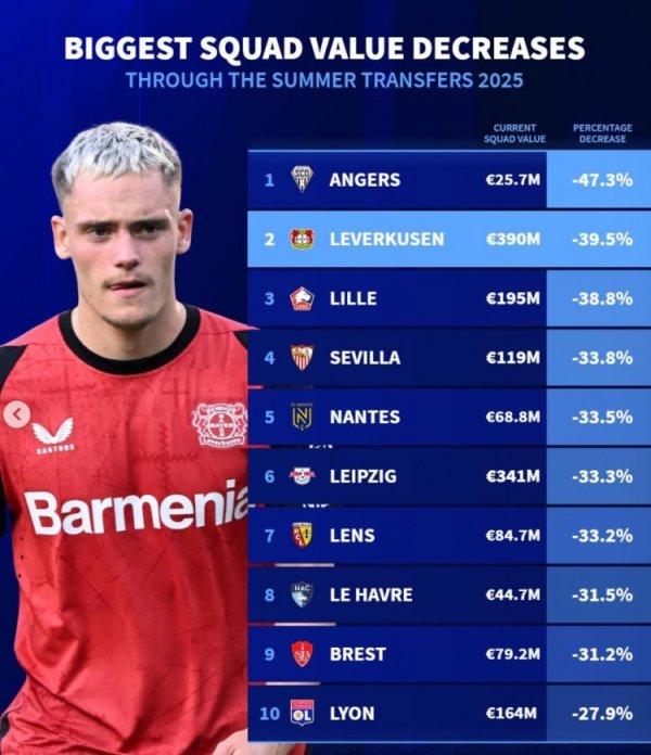 9月7日讯 《转会商场》统计了今夏转会窗事后的总身价下降比例情况,昂热居首,法甲7队在列。 德转列今夏身价着落比例榜:欧元 1.昂热,2570万,-47.3% 2.勒沃库森,3.90亿,-39.5% 3.里尔,1.95亿,-38.8% 4.塞维利亚,1.19亿,-33.8% 5.南特,6880万,-33.5% 6.莱比锡,3.41亿,-33.3% 7.朗斯,8470万,-33.2% 8.勒阿弗尔,4470万,-31.5% 9.布雷斯特,7920万,-31.2% 10.里昂,1......查看更多