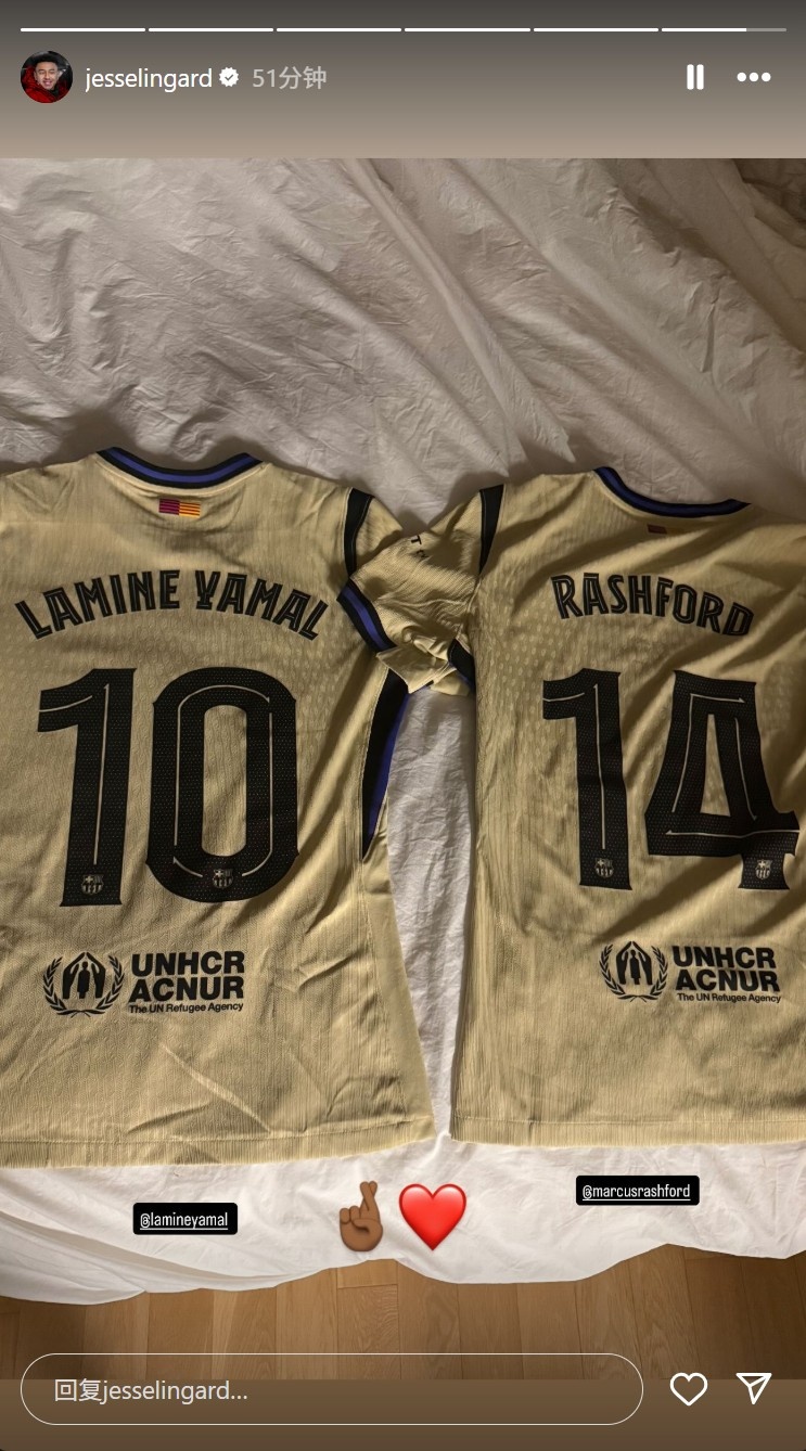 林加德赛后更新社媒,晒亚马尔、拉什福德球衣:🤞🏽❤️
