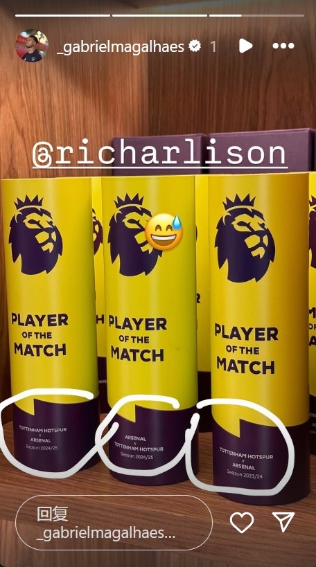 赛后,理查利森在个东谈主社媒晒了他拿着全场最好球员奖杯的相片,并符号了阿森纳后卫加布里埃尔。随后,加布里埃尔更新社媒,晒出我方3次拿到英超北伦敦德比全场最好的奖杯赐与对抗,他也艾特了理查利森。