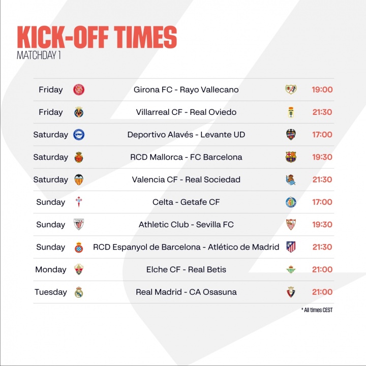新赛季动身,巴塞罗那客场对阵马略卡,皇家马德里主场迎战奥萨苏纳