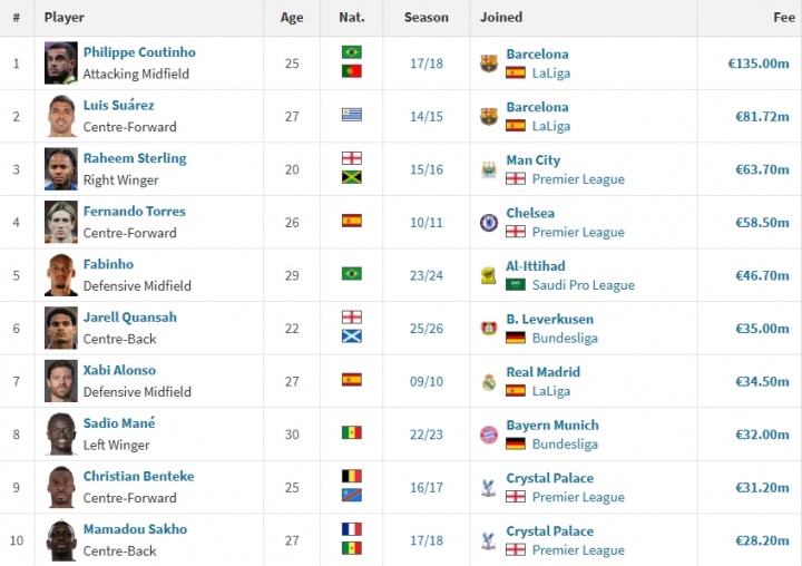 利物浦队史卖东谈主榜 (欧元) 一览: