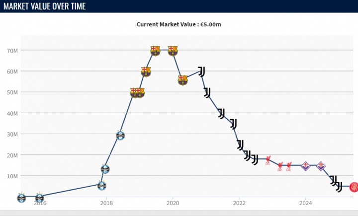据德转数据,阿图尔与尤文的公约将于2027年到期,这位照旧的天才中场也从巅峰时辰7000万欧元身价,跌至如今的500万欧元。