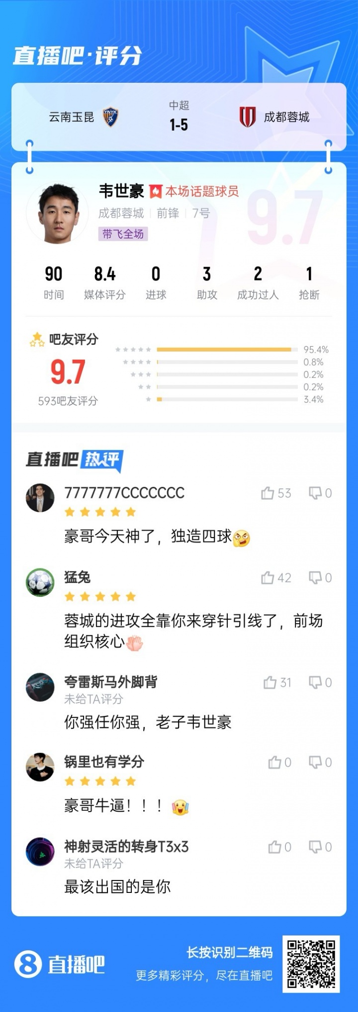 【】中超第五轮最好球员:李源一!吧友评分9.9国产助攻王