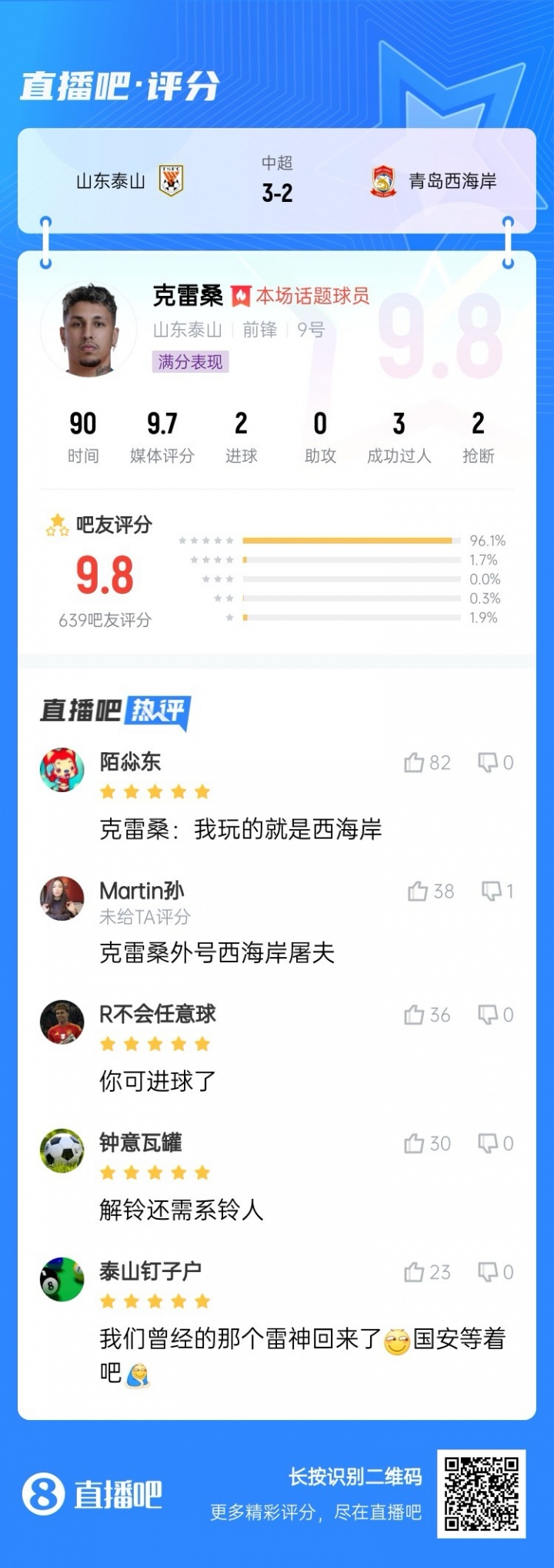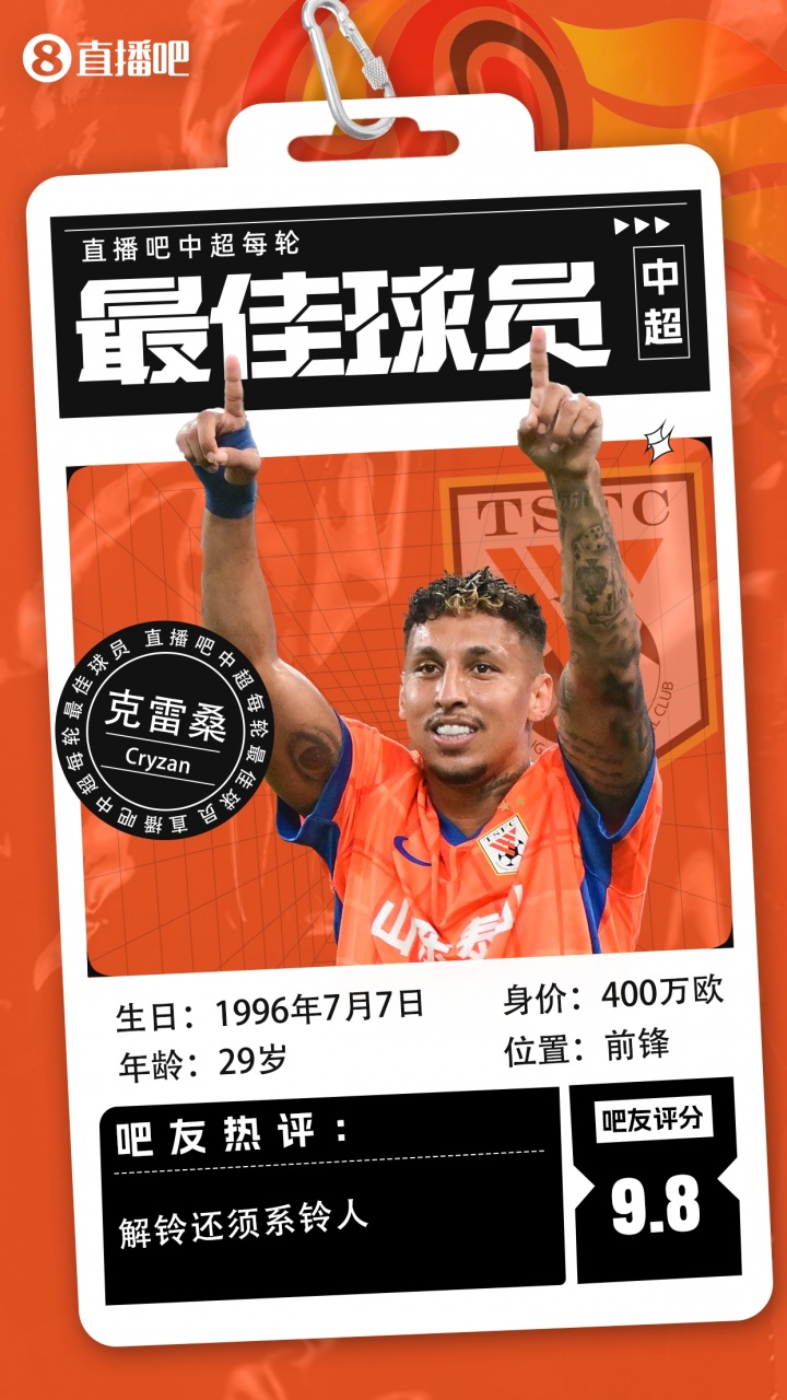 【】中超第22轮最好球员评比效果出炉,克雷桑当选本轮最好!克雷桑在山东泰山与青岛西海岸比赛中自便球破门+双响,冲突个东说念主中超赛场4个多月球荒。克雷桑本赛季第三次得到评比中超当轮最好球员。