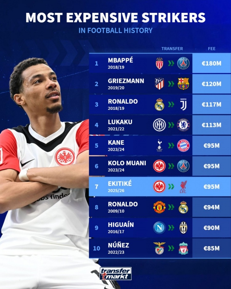 足坛历史时尚转会费榜:姆巴佩1.8亿欧居首,埃基蒂克9500万欧第5
