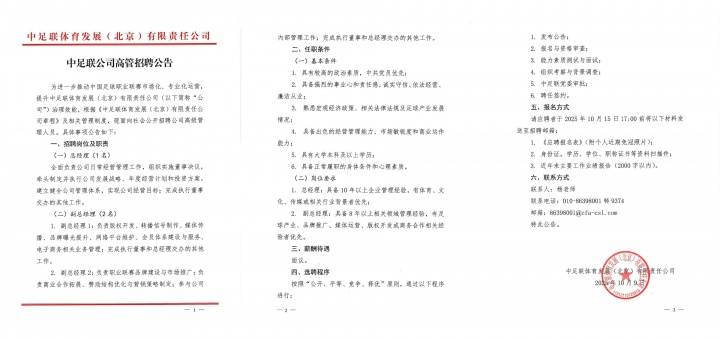 9日晚,中足联官方发布见告,中足联体育发展(北京)有限包袱公司公开招聘总司理(1东说念主)、副总司理(2东说念主),共3名高管。而据了解,这仅仅中足联里面东说念主员调度职责的一部分。中足皆集下来将组织一次全面里面东说念主员招聘,招聘岗亭不仅限于算作中足联指标机构的中足联公司,还波及中足联其它关连职能部门,如竞赛、裁判、女子等部门。