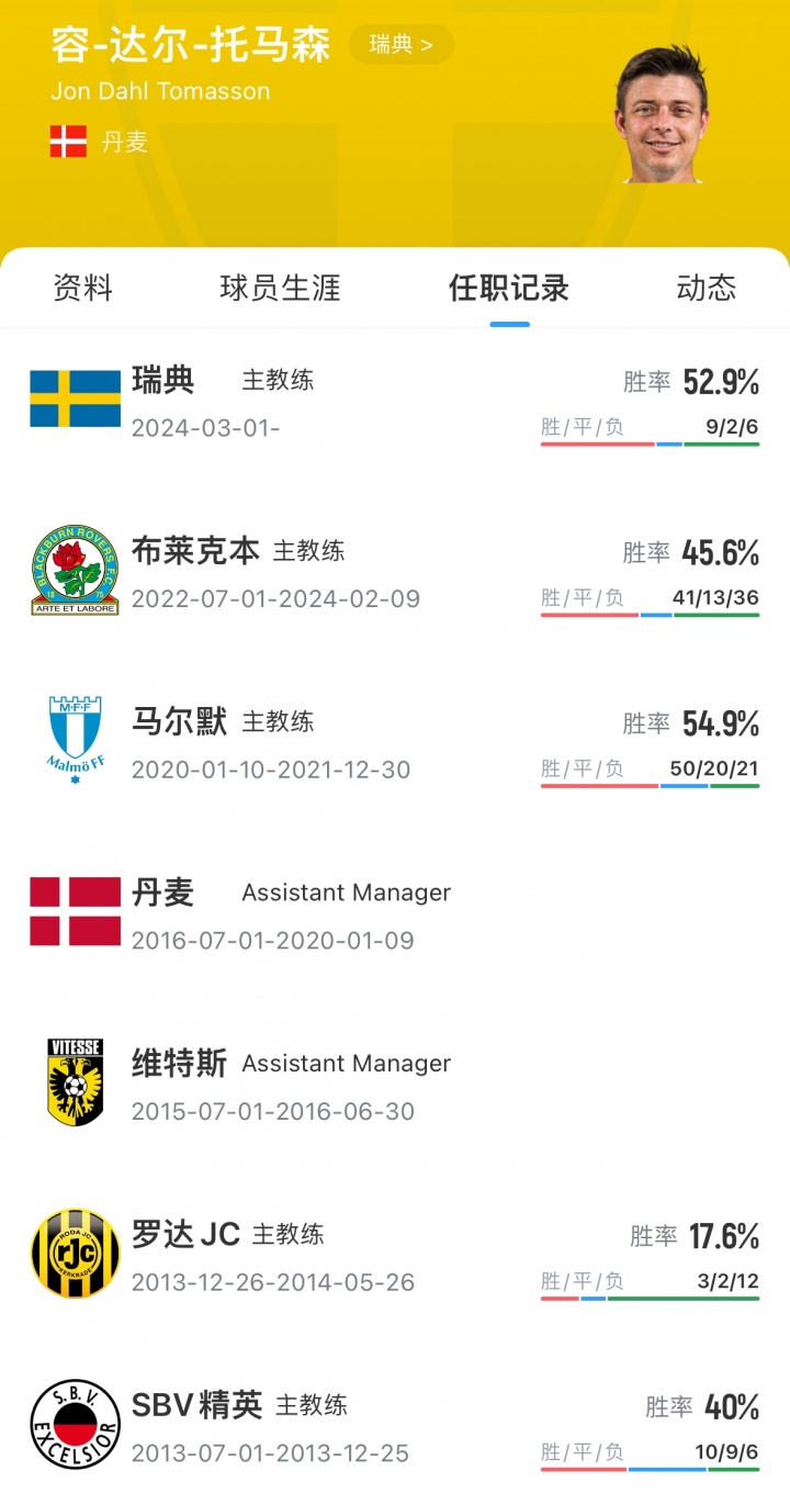 瑞典主帅托马森现年49岁,2024年3月上任瑞典主帅。他带队17场9胜2平6负。在这两个月进行的世初赛中,瑞典3负1平仅积1分小组垫底。