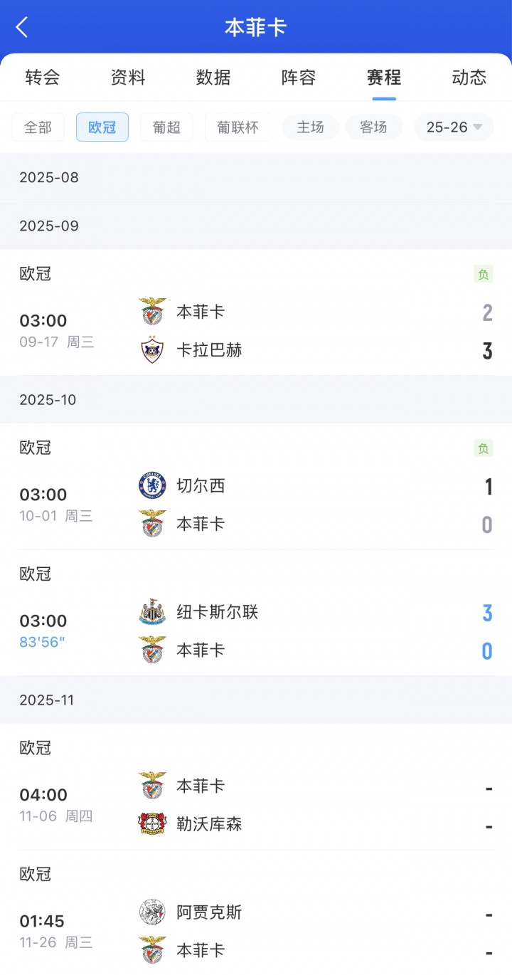 10月22日讯 北京时辰10月22日星期三03:00,欧冠联赛阶段第3轮,本菲卡客场0-3完败纽卡斯尔,本菲卡欧冠碰到3连败!