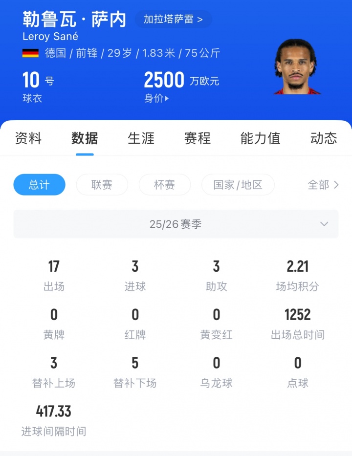 本赛季萨内代表加拉塔萨雷出战17场比赛,孝顺3粒进球和3次助攻,其中土超11轮3球1助。在本轮的欧冠比赛中,萨内送出一次助攻。