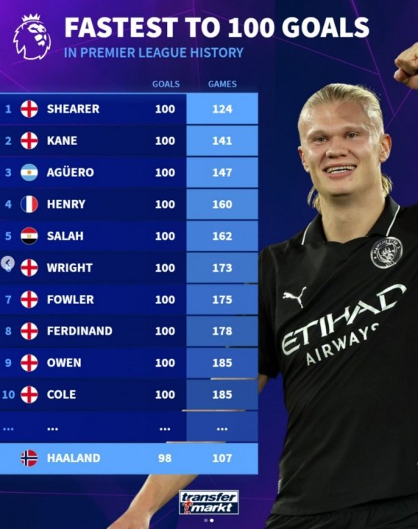 英超最快终了百球记录榜:希勒124场居首,哈兰德当今107场98球