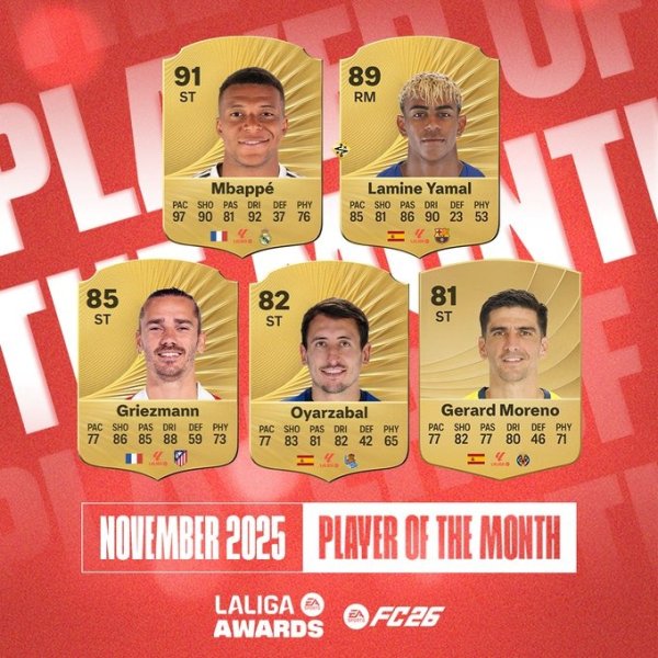西甲11月最好球员候选:格列兹曼、姆巴佩、亚马尔在列