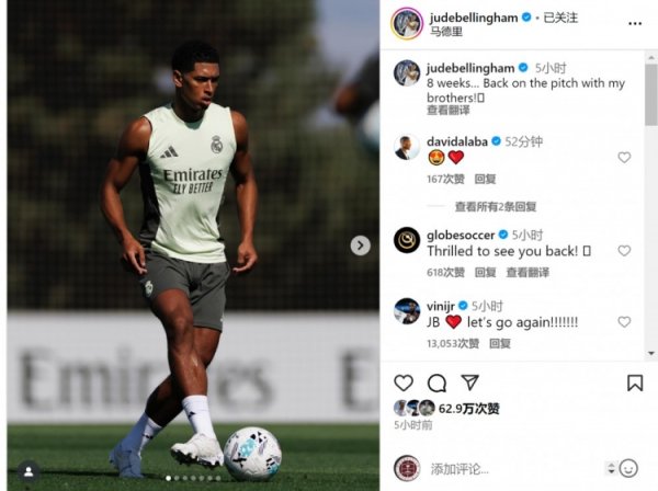 贝林厄姆晒老练像片:缺席8周,终于回到球场与昆玉们在一齐