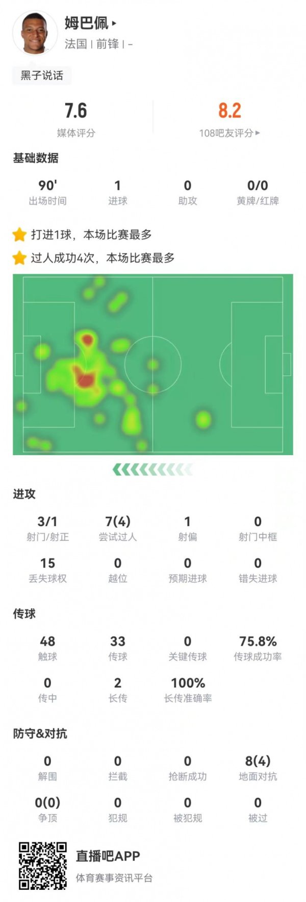 姆巴佩本场4射2正进1球+1失良机 7过东说念主4见效+15丢失球权 获7.6分