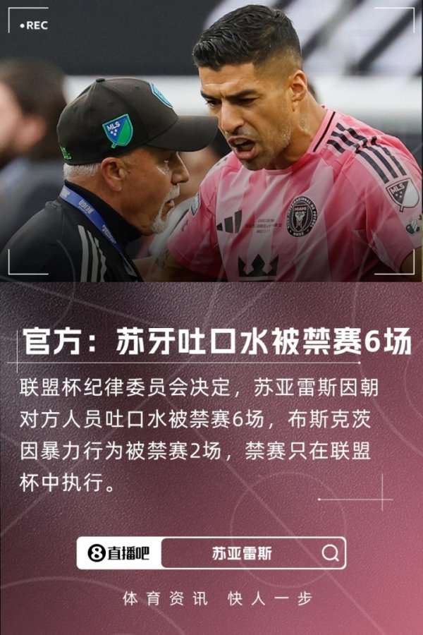 09月06日讯 定约杯次序委员会决定,苏亚雷斯因朝对方东谈主员吐涎水被禁赛6场,布斯克茨因暴力算作被禁赛2场,只在定约杯中实行。 定约杯决赛迈阿密海外0-3不敌西雅图海湾东谈主,赛后两边发生冲破,苏亚雷斯向对方使命主谈主员吐涎水,布斯克茨则向对方中场巴尔加斯挥拳。 迈阿密海外0-3西雅图海湾东谈主冲破处罚: 苏亚雷斯:禁赛6场 布斯克茨禁赛:2场 阿维莱斯:禁赛3场 海湾东谈主队训导史蒂文-伦哈特:禁赛5场 把柄定约杯规程,系数四名受处罚东谈主员还将因其算作受到罚金。系数禁赛......查看更多