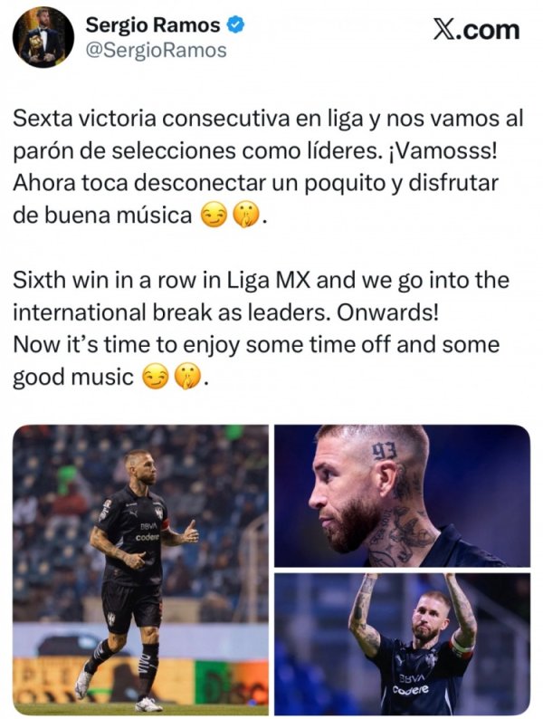 助蒙特雷联赛6连胜&榜首,拉莫斯社媒:是时分裁减裁减,听听音乐