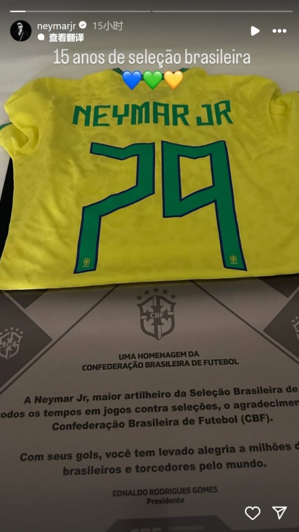 巴西队首秀15周年!内马尔社媒晒国度队79球缅念念球衣