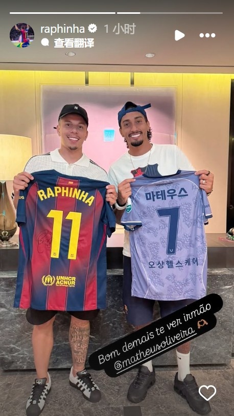 拉菲尼亚与K联赛外助交换球衣,晒照并配文:很欢欣见到你 昆季