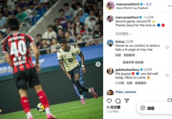 拉什福德社媒:第二场比赛&第二场得手,感谢首尔的热心救助!