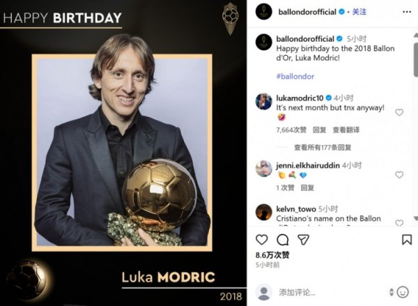乌龙,金球奖官方祝莫德里奇生快,后者陈说:谢谢,不外是鄙人月