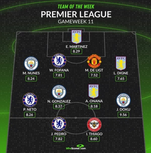 Whoscored评本轮英超最好阵:多库领衔,德里赫特、佩德罗在列