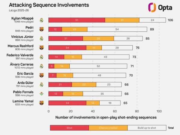 本赛季西甲参与有用遑急排行:姆巴佩106次居首,佩德里89挨次二