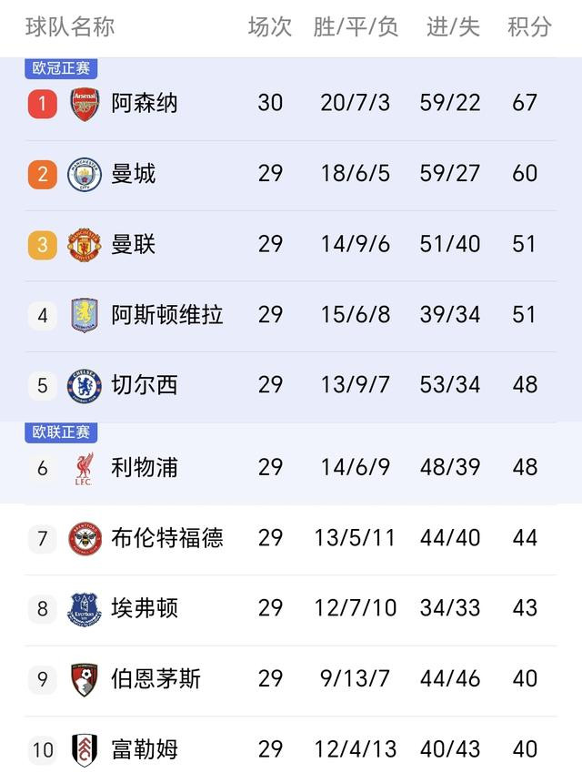 上周末英超第29轮踢完,整个争冠和争四形势像是被拧了一把——表面看阿森纳还稳稳在前面,但曼城、曼联、维拉、利物浦全在同一天露了破绽。不是输一球两球的问题,是每支强队都暴露出自己最怕的那一块:体能顶不住、中场接不上、防守犯低级、红牌来得莫名其妙。