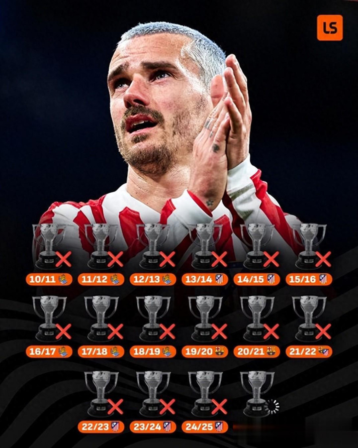 格里兹曼的荣誉室里并不贫瘠:大力神杯、欧联杯第一名 、西班牙超级杯……他几乎赢得了一切能赢得的,唯独缺了那一座西甲奖杯。他是西甲历史上最高效的前场球员之一,是马竞队史的射手王,是那个在场上不遗余力回防、组织、得分 的“全能战士”。但正如图片中那一个个刺眼的红色叉号,他在职业联赛 夺魁 图谱上,始终处于完美的错位之中。