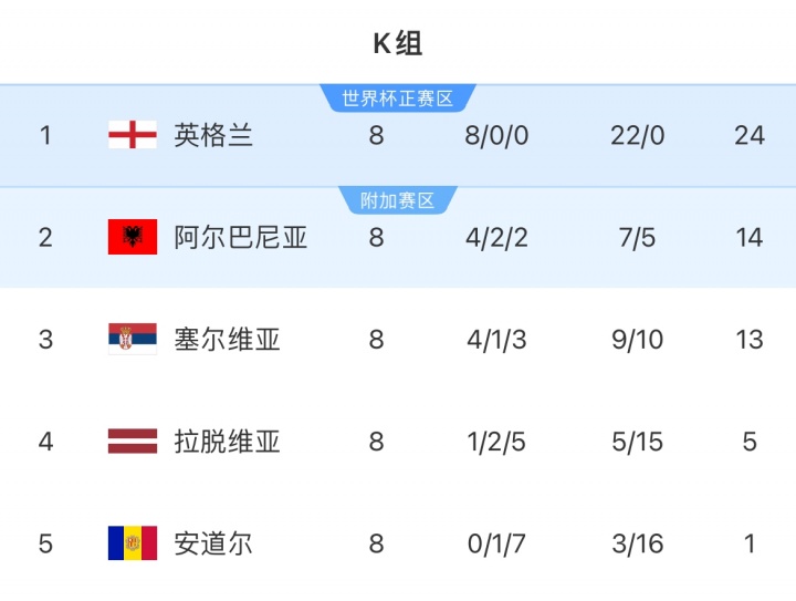 世欧预K组:英格兰10分上风一骑绝尘,阿尔巴尼亚1分跨越塞尔维亚
