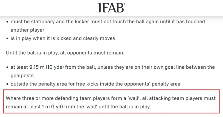 IFAB官设施例:当三名或三名以上驻扎队员构成“东说念主墙”时,通盘蹙迫队员必须距离“东说念主墙”至少1米,直至比赛再走时行。