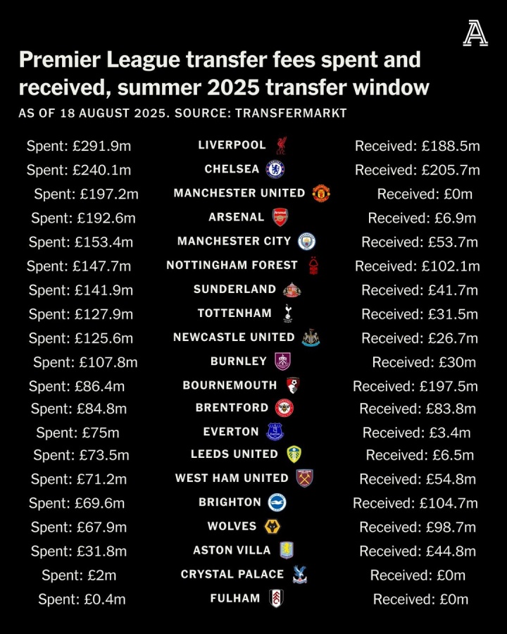 英超20队夏窗相差榜:曼联净开销1.97亿最多 伯恩茅斯净赚1亿多