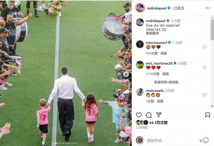 德保罗在迈阿密外洋主场对阵辛辛那提FC的比赛前亮相,这位阿根廷球员社媒晒出相片,配文:“何等相配的一天!感谢民众。”