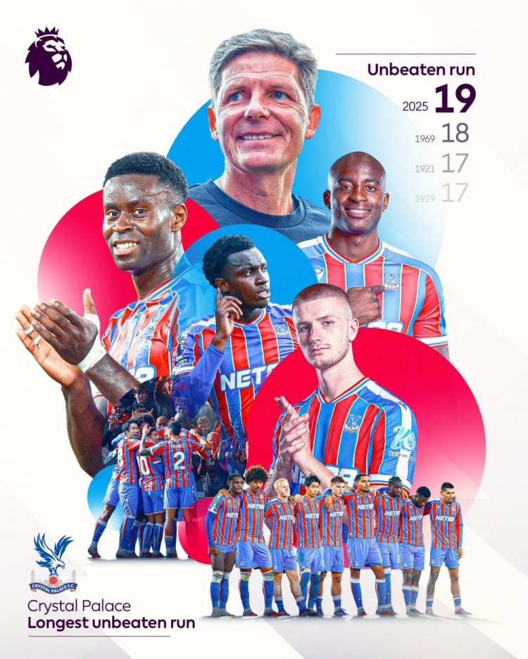 据英超官方统计,水晶宫各赛事19场不败,创造队史最长不败记录。