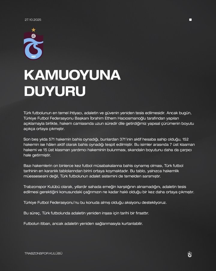 10月27日讯 土超特拉布宗俱乐部发表公开声明,回答土耳其足协主席哈奇奥斯马诺格鲁所揭露的裁判界“结构性退步”问题。
