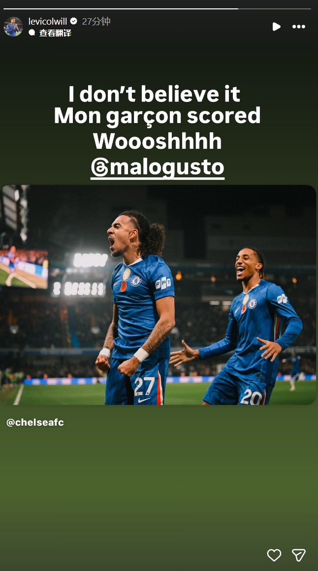 他的队友科尔维尔也通过社媒晒照嘲谑:“我不折服!我的男孩进球了,嗖!@古斯托”。