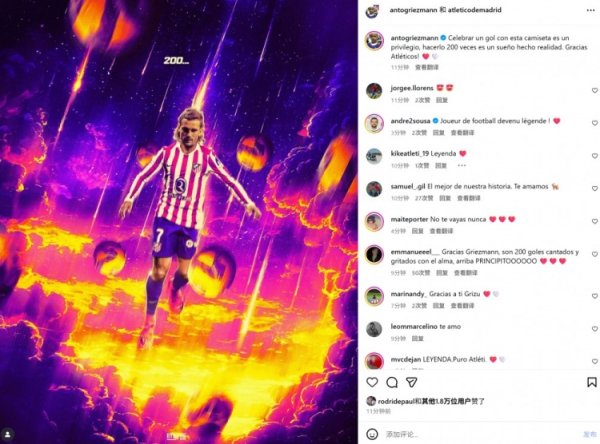 格列兹曼闭幕马竞生计200球里程碑,马竞官推晒海报:听说!